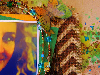 A close up of the beaded frame and background work using Distress Stains and Dylusions spray ink.