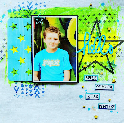 Hi Elisa here with my entry for the May Challenge over at Scrapbooking Top 50oz Blog. I just had to participate in this challenge I loved the sketch! I found the quote online (unknown) and thought it fit in with my star theme. This photo of my eldest son is my favourite, it has such vibrant colours in it so when I was rummaging through my scrap supplies I saw my neon paints and decided to do a mixed media background. I loved how this layout turned out. Make sure you pop over to the Challenge Blog and check out this month's challenge.