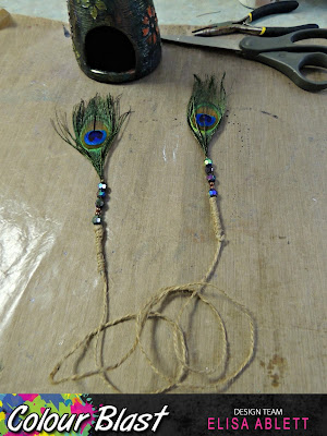 Next iImade the bohemian style 'lariat' which is a necklace or length that does not have a clasp, you have to knot the two ends together. From the photo below you can see I cut the feathers down and stripped them of a few inches of the thin smaller feathers from the length, I then added a stopper near the head of the feather and added my beads. I then put glue on the end of the feather where my twine was to go and slowly wound and twisted the twine in a spiral to finish off the ends of the feather.