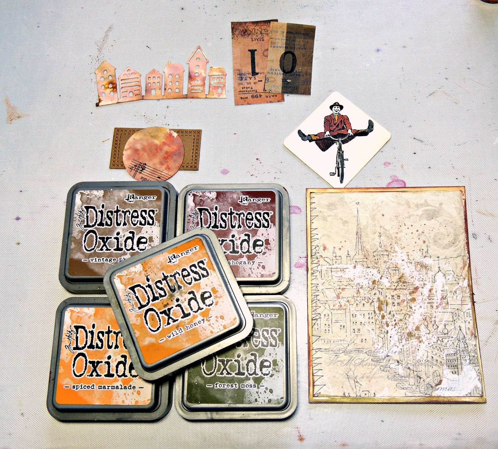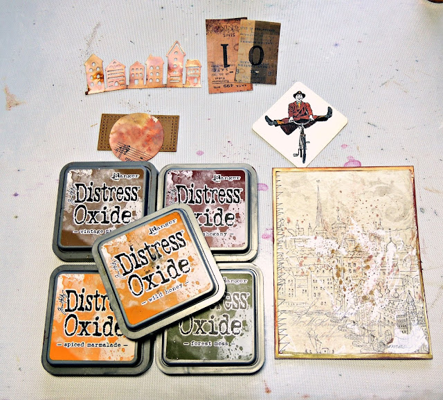 Add some splatters of distress oxide ink to your background and also around the edges. Colour your city scape die cut as well as a few pieces of ephemera including tickets and music paper. I like to add colour by scraping my inkpad over a craft messy mat and spritz the ink with water until it beads. then I dip my paper and tap it in the colour on the messy mat and dry with a heat gun.