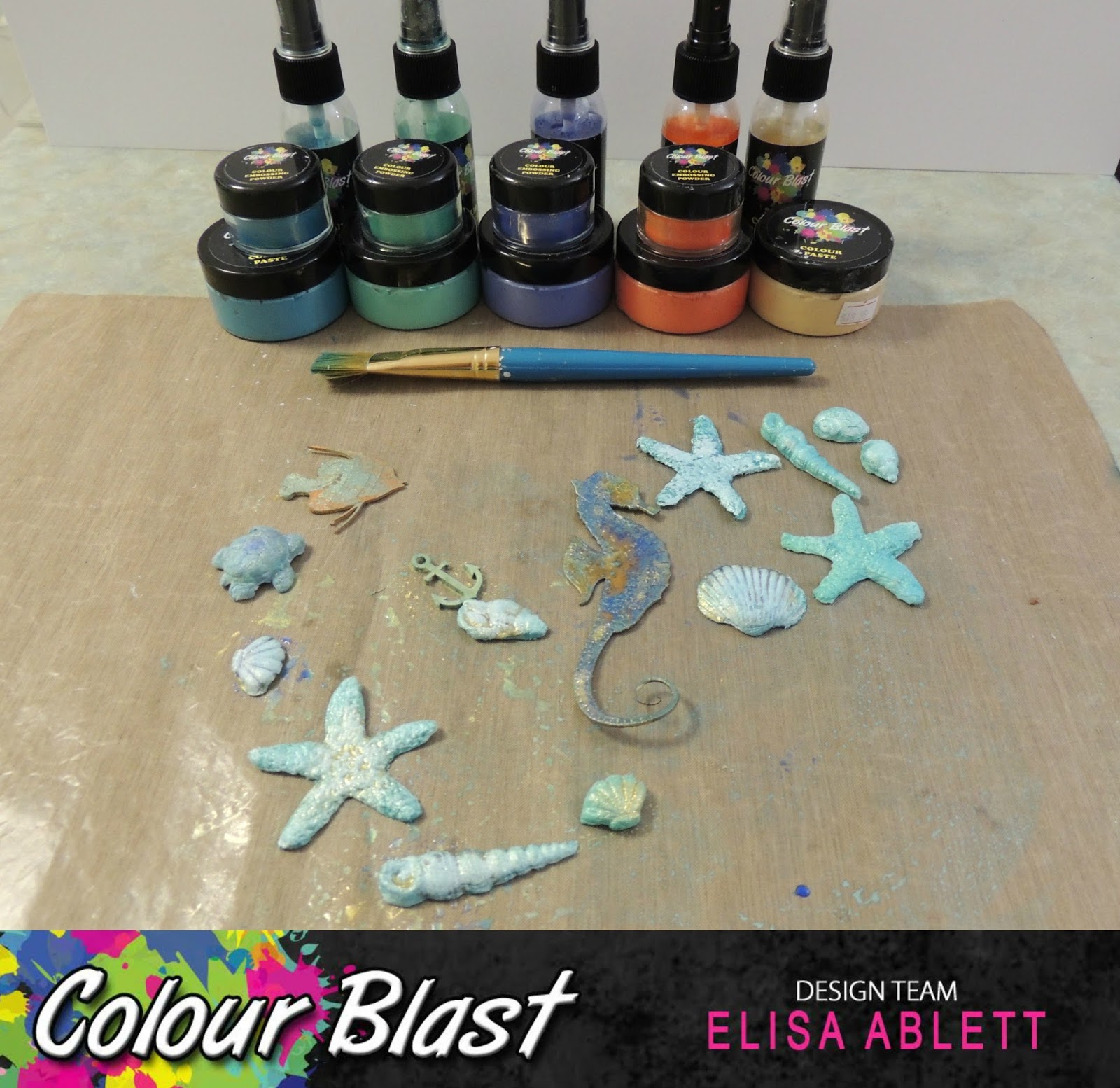 The Colour Blast pastes, sprays and embossing powders that I have used with this project are as follows:- Tangareen Dream, Snow White, Bling, Envy, Deep Water and Just Blue. Click on the link to take you to the Colour Blast shop!!