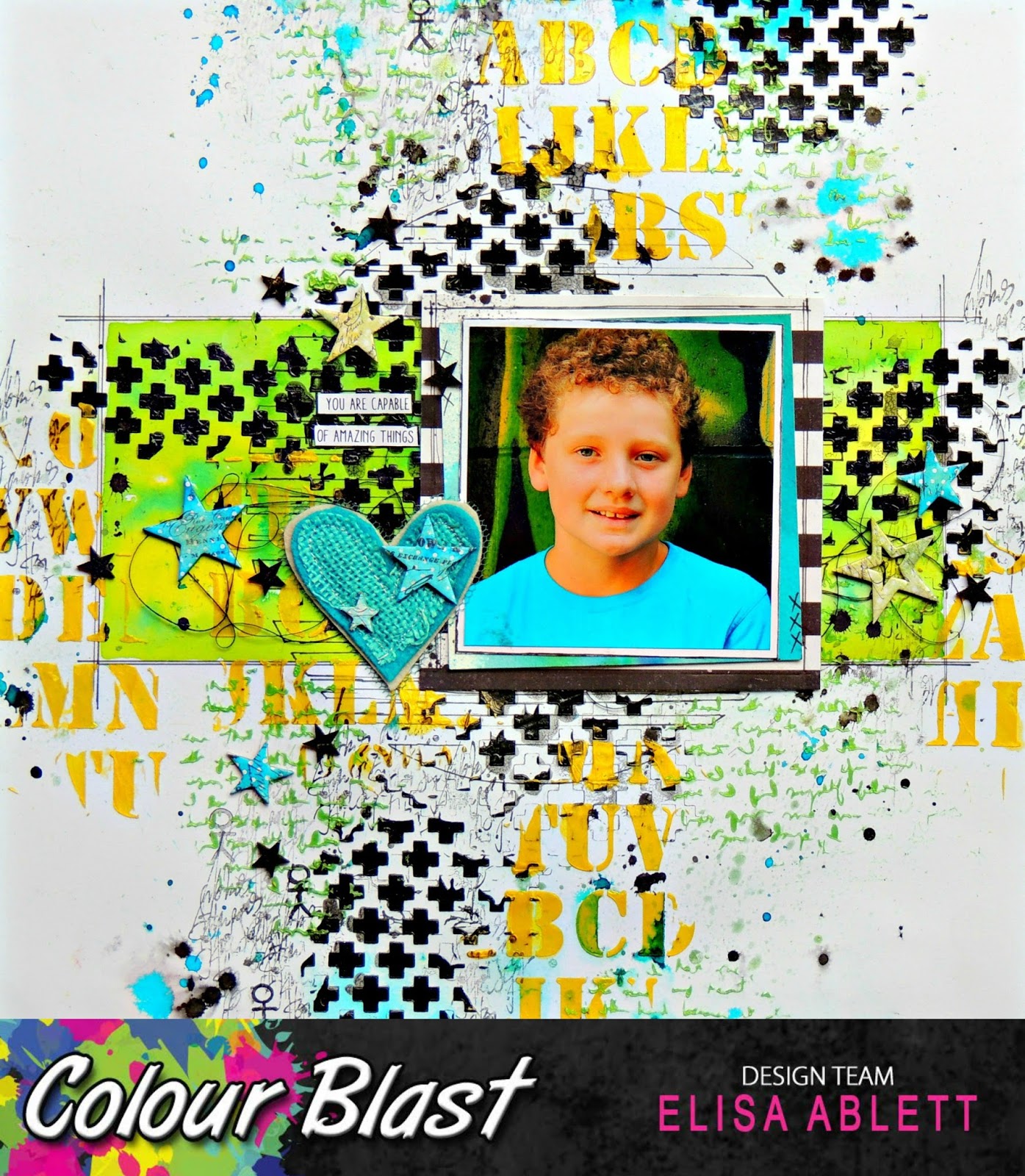 My turn up on the Colour Blast blog today with a bright and vibrant yet grungy boy mixed media layout.